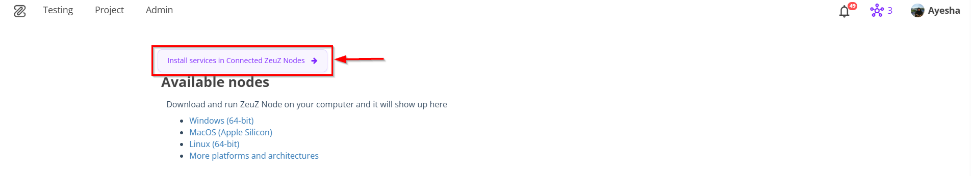 - At first we have to download the inspector, to do this we have to navigate to the Installer/Install services page (from menu click on the "Node" icon and you must see: Install services in Connected ZeuZ Nodes →).