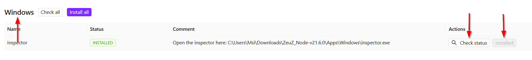 - First, click the Check Status button to verify the status of the Windows Inspector.