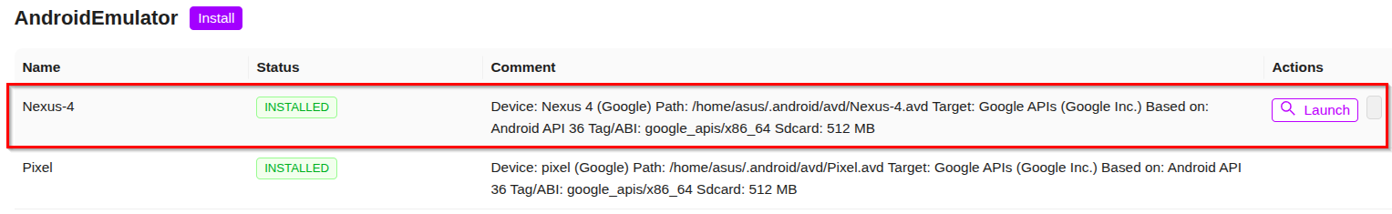 - Launch your installed Android Virtual Device by clicking the "Launch" button.