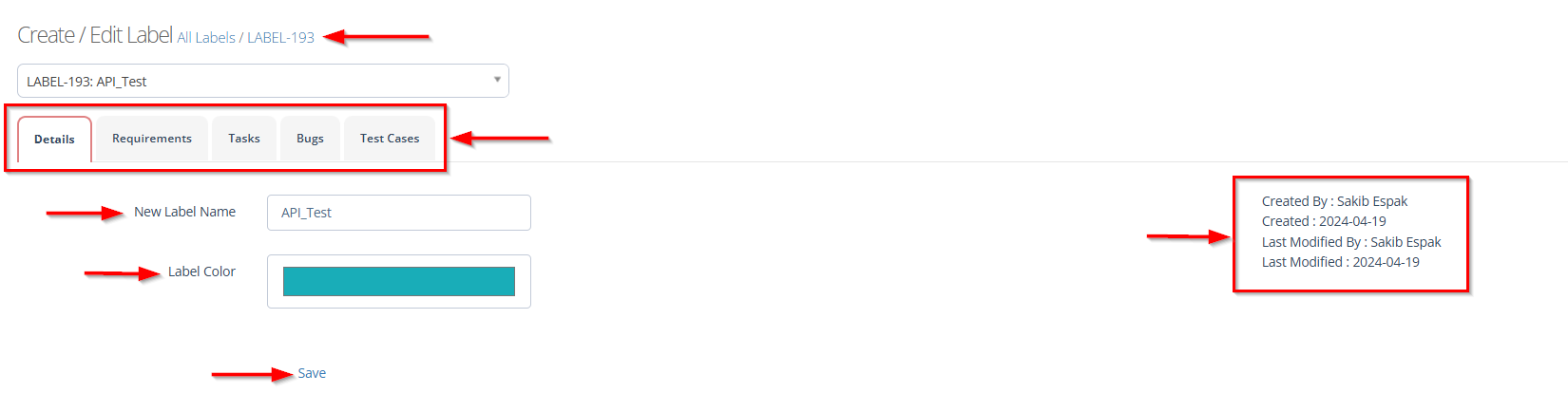- Label does not appear under Requirements, Tasks, Bugs, or Test Cases: The label must first be saved in the Details tab. Without saving, the label cannot be used in other sections.