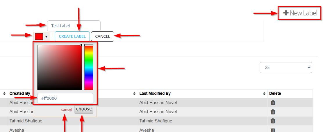 - Create Label: Click the + New Label button at the top right to create a label, enter the Label name and optionally choose a color in the form that appears.