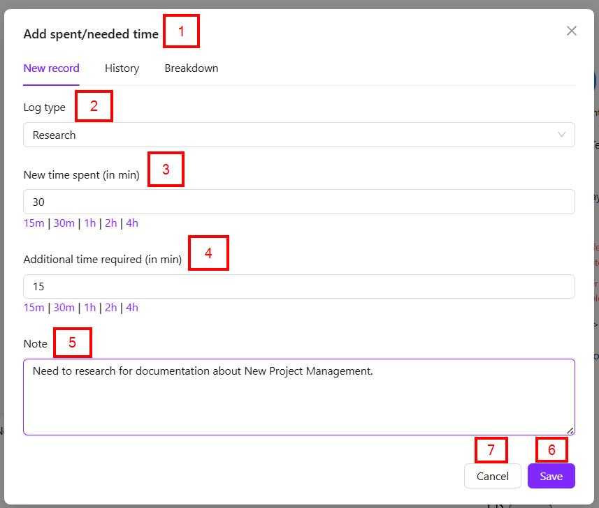 New time spent (in min): This field captures the actual time already spent on the task. Quick selection options such as 15 minutes, 30 minutes, 1 hour, and more are provided for convenience.