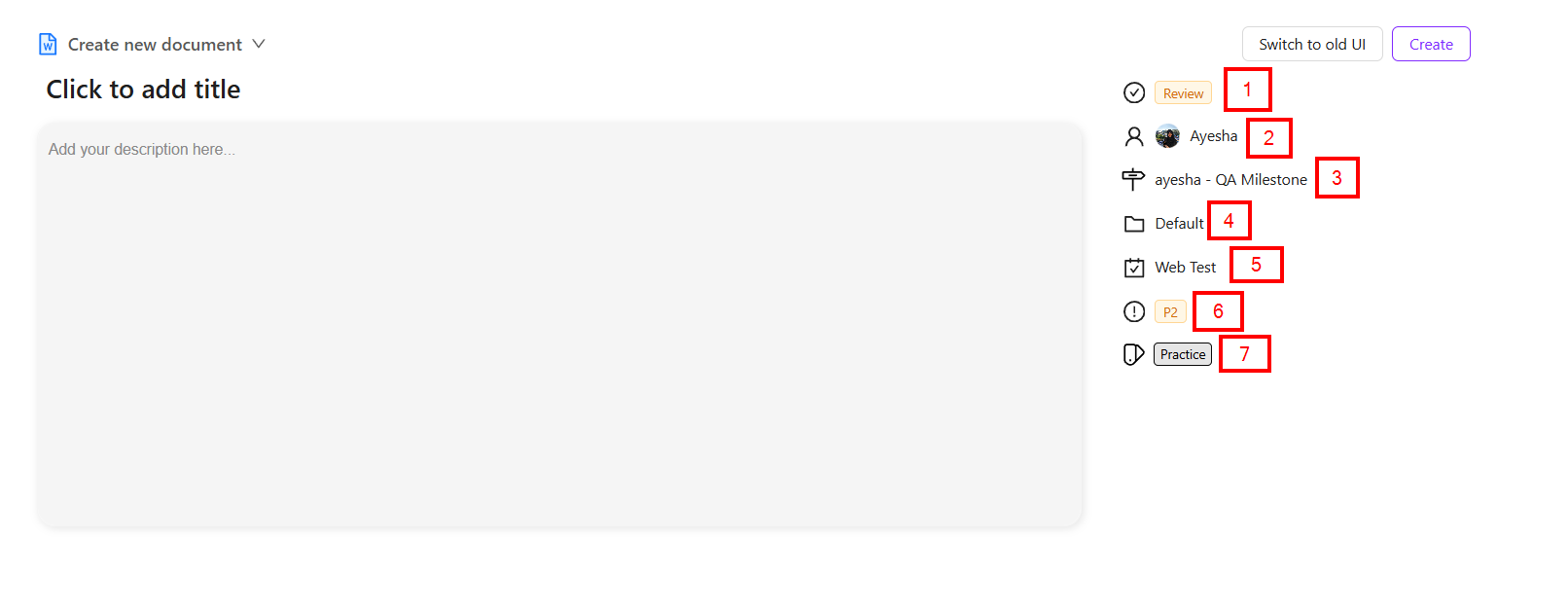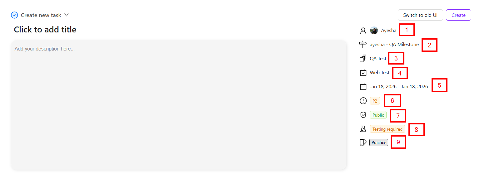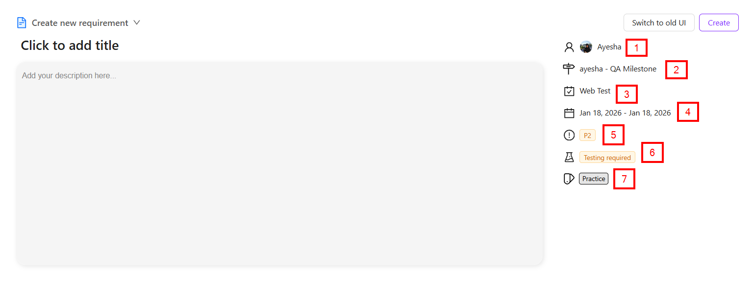 - At the top-right corner, the Create button is used to save the requirement, while Switch to old UI allows returning to the previous interface.