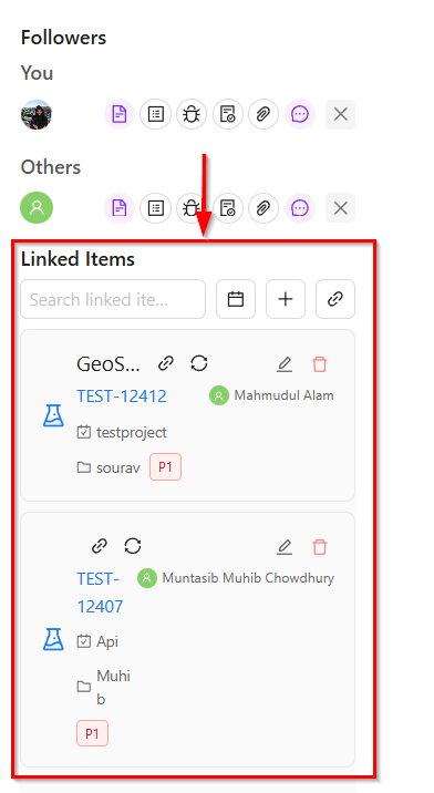 - You: Indicates that the current user is following items such as details, tasks, bugs, test cases, attachments, and discussions, and will receive updates related to any changes or activities. An option to remove the follower is also available.
