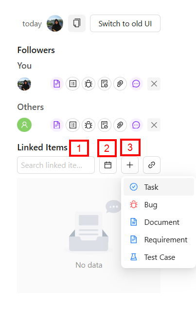 - Plus (+) Icon: Opens a menu for creating or linking new items, such as, Task, Bug, Document, Requirement, or Test Case.