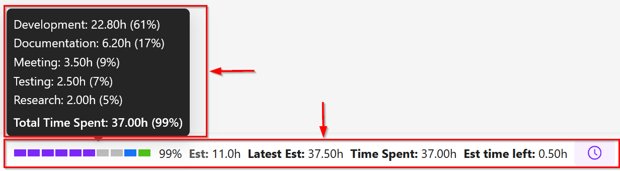 - The latest estimation, time spent, and estimated time left are displayed using different icons to clearly distinguish each value.