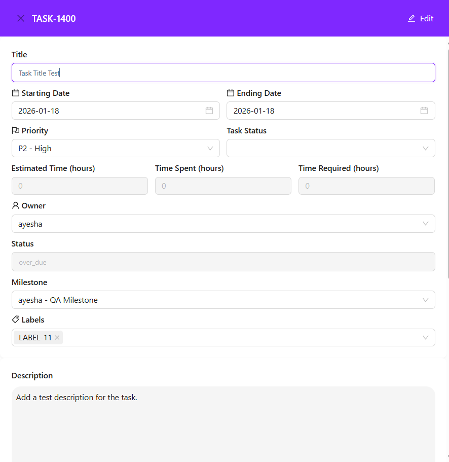 - Labels: Labels can be applied to a task using the Labels button or by searching for an existing label. By default, the task has No labels, and new labels can be created using the Create Label button.