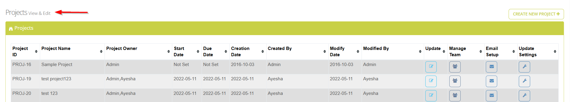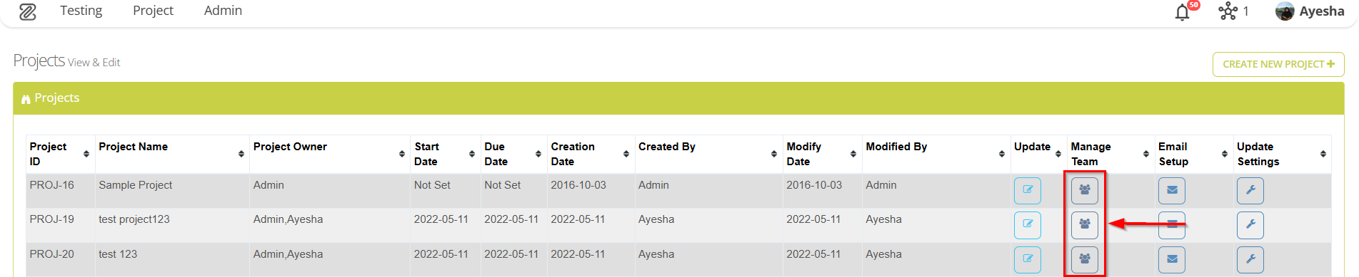 - Click on the Manage Team button available on the "Projects" page.