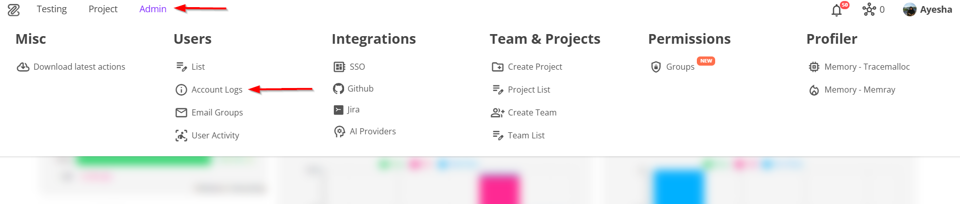 Account Logsoption available under the "Admin" section in the menu bar.