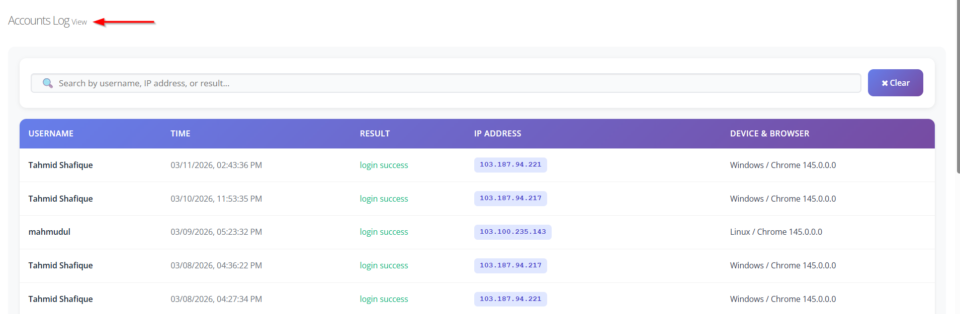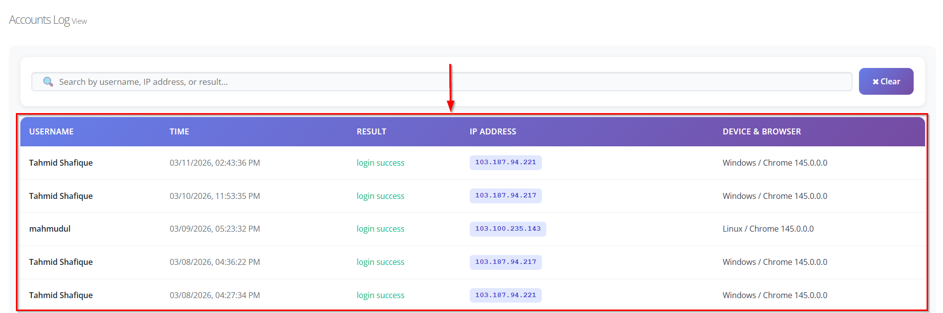- Search Functionality: Allows users to search logs using the username, IP address, or result.