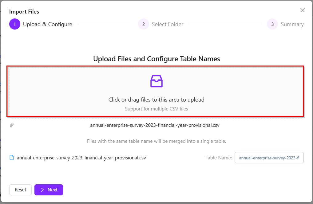 • Easy imports: Upload or merge existing CSV files directly into tables from the UI.