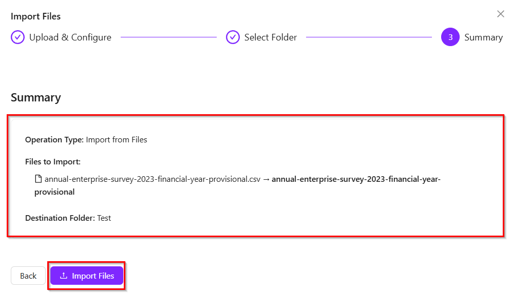 On success, the UI refreshes the datastore and folder queries. If files are still missing, check the destination folder filter, refresh or re-run the search, and verify the import status in the API response or server logs.