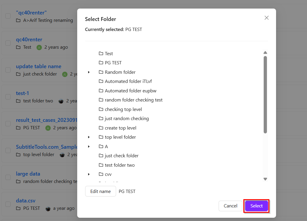 2. To move items between folders, open the folder modal from a card and select the target folder.