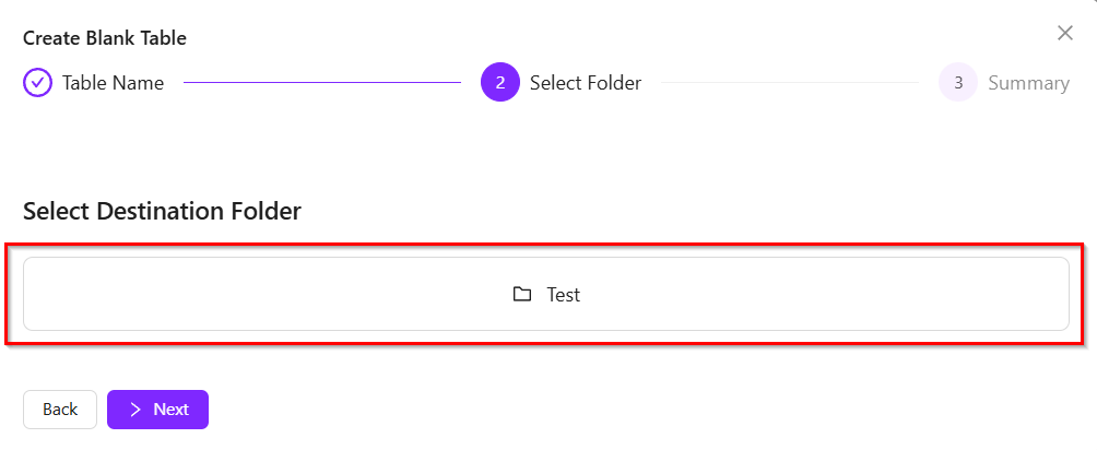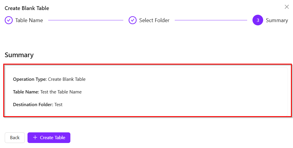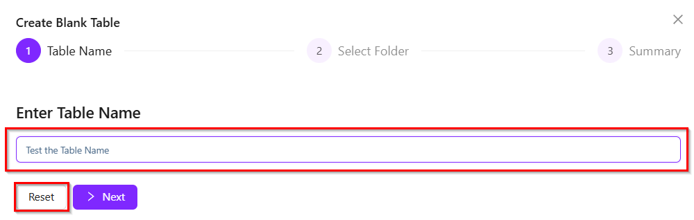 Required fields, such as table names for imported files or blank table names, must be filled in. The modal validates these fields before enabling the Next or Finish button.