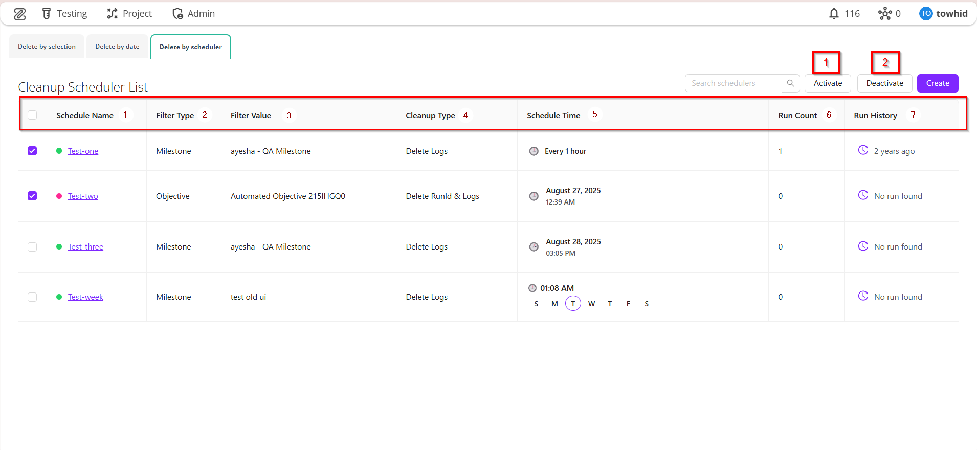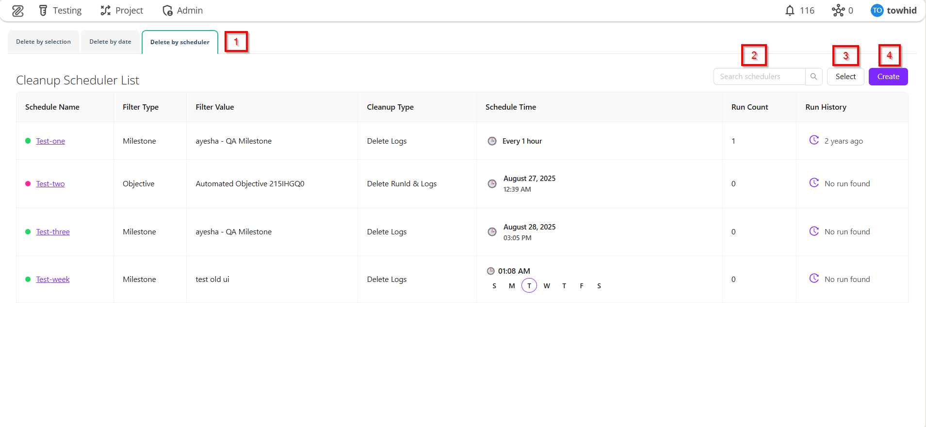- Schedule Name: The name given to the cleanup schedule (e.g., Test-one, Test-two).