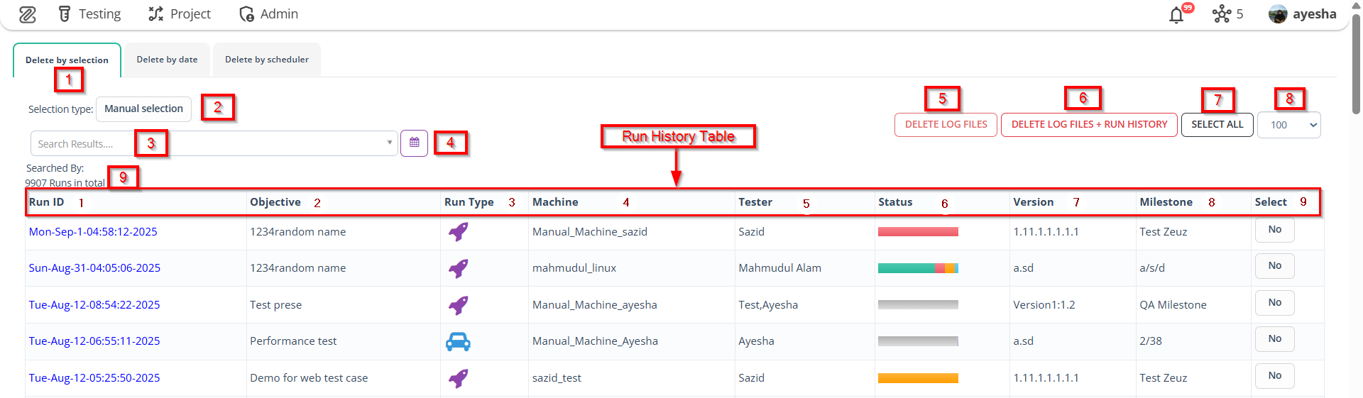 - Delete by selection: Allows the users to manually select specific runs and delete them.