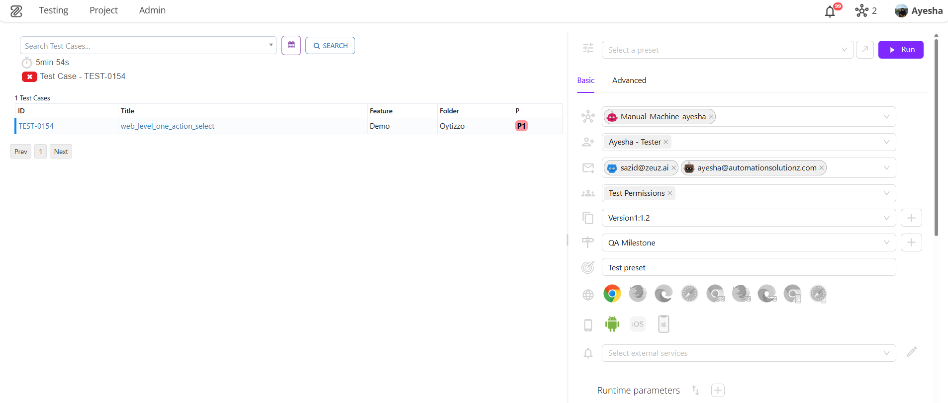 Example: Two users are assigned: Test (TE), Ayesha (AY). - Emails: Specific emails are listed to receive notifications about the test execution.