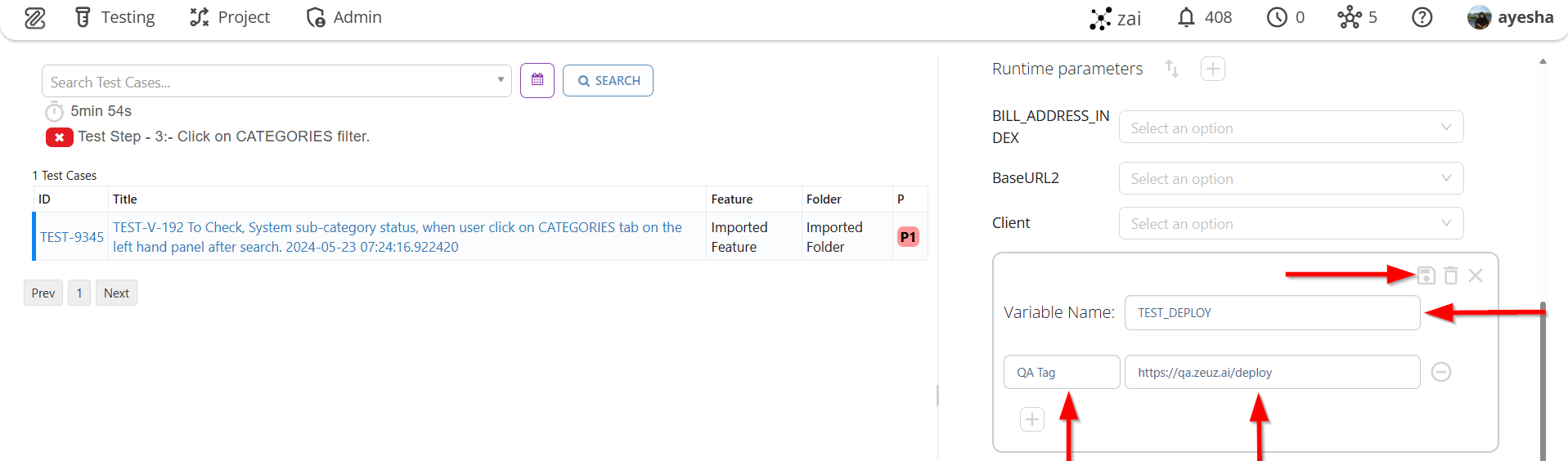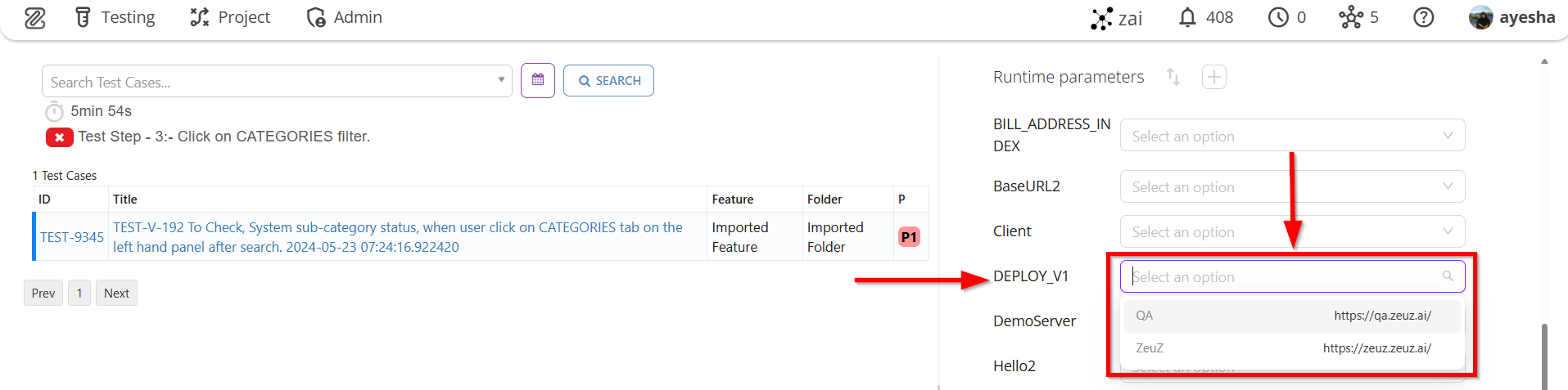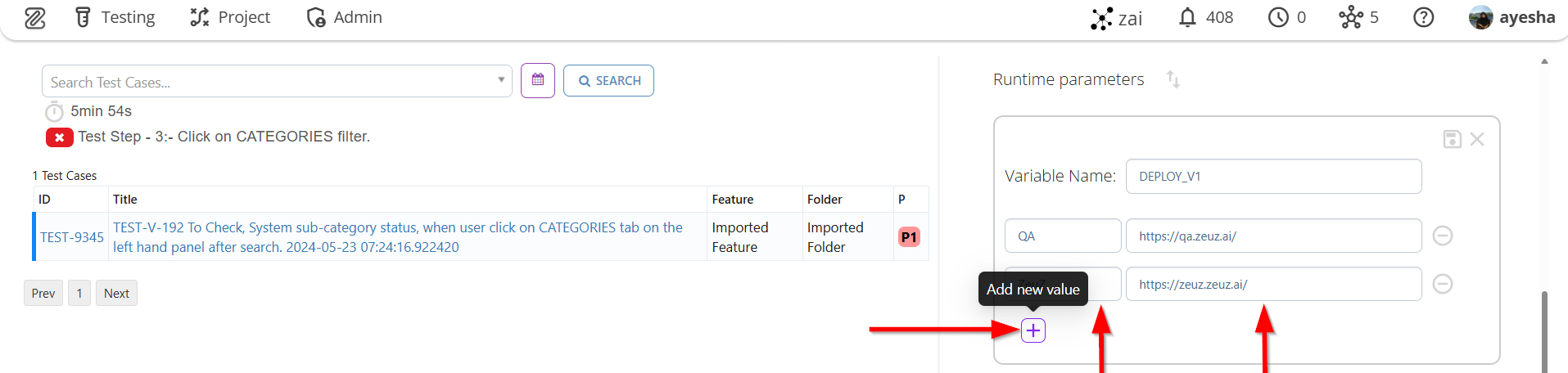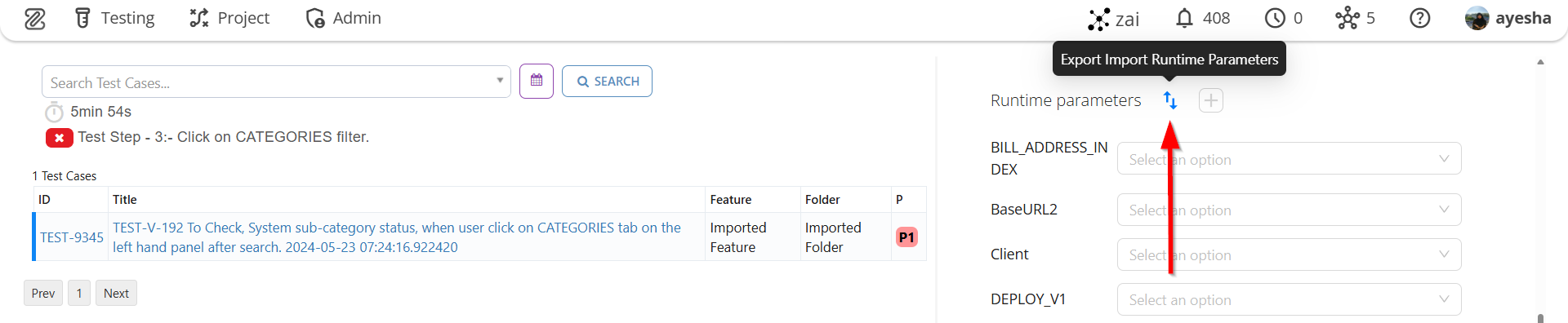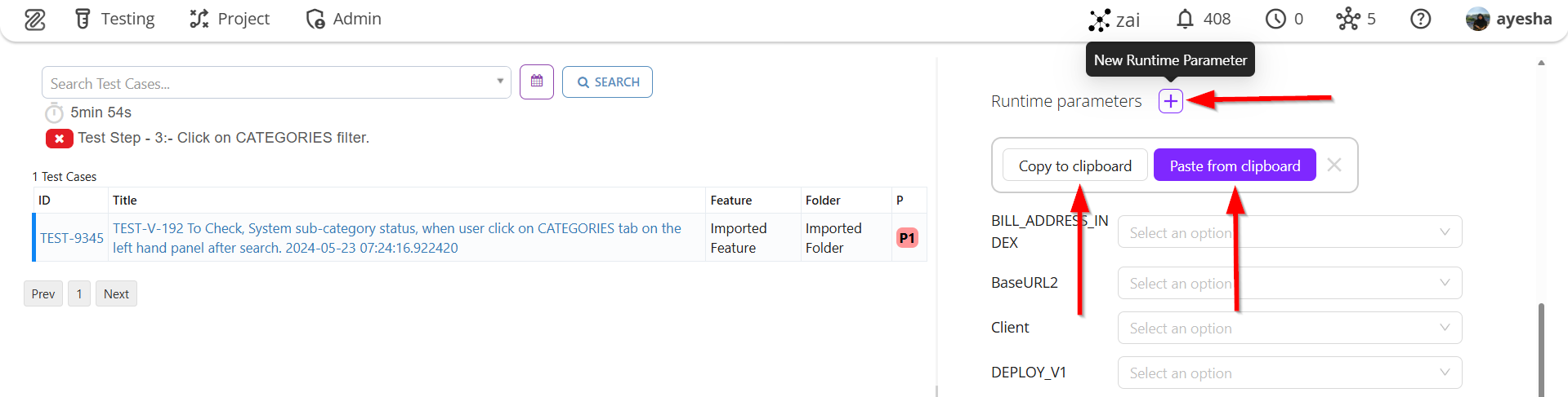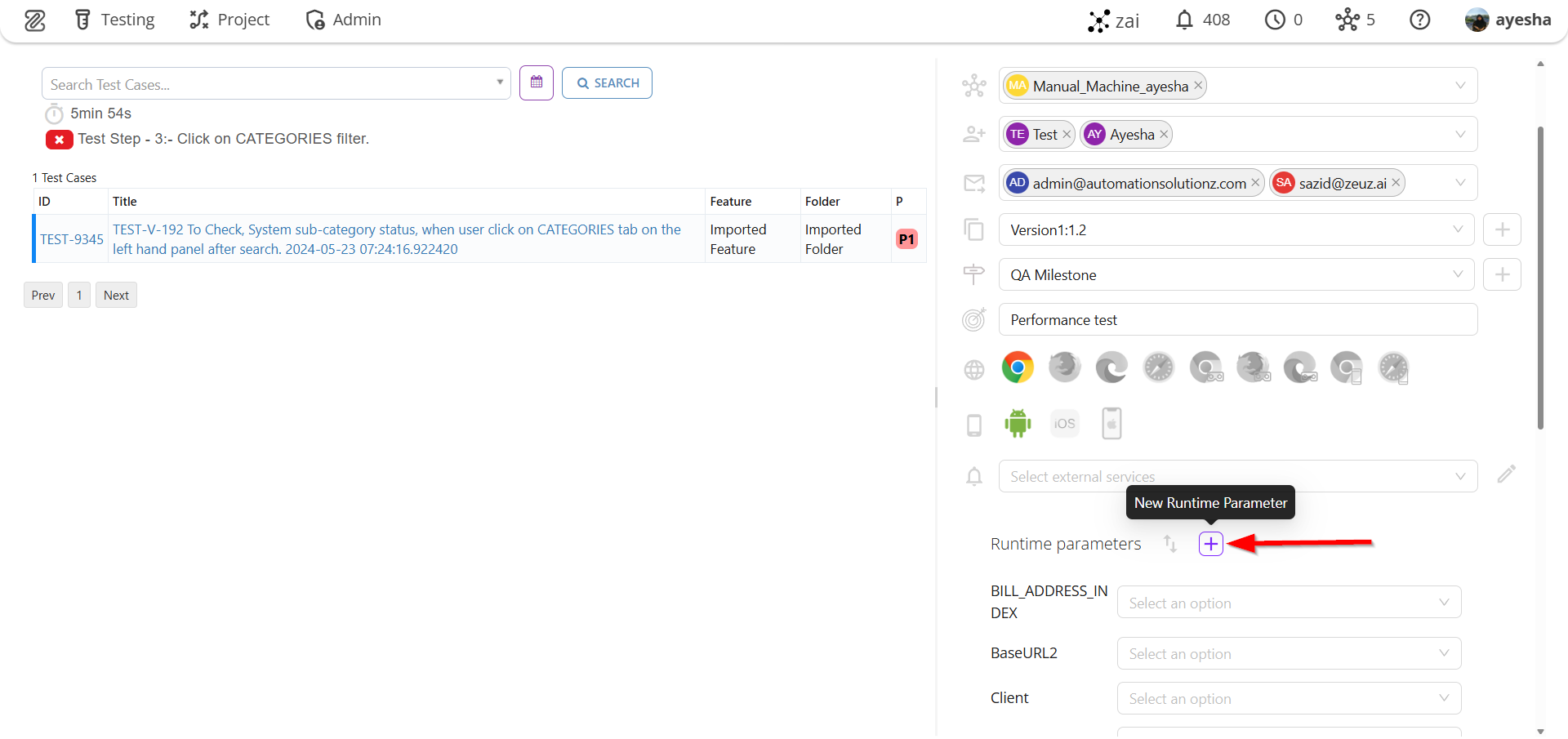 The New Runtime Parameter option allows users to define dynamic input values for test cases, enabling flexible and data-driven test execution.