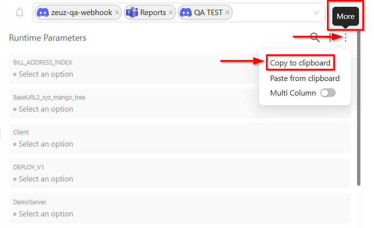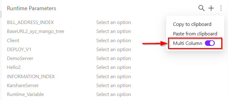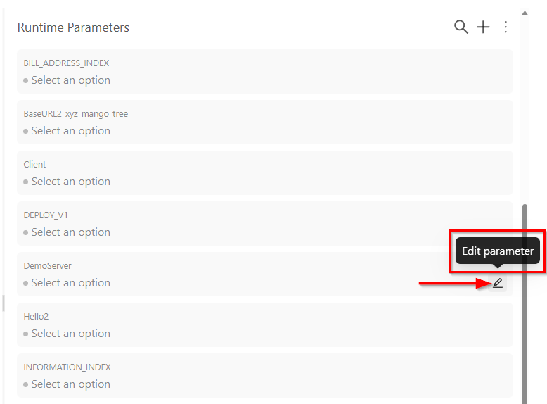 - Use the More (three dots) icon for additional actions or settings related to runtime parameters. The available options are: