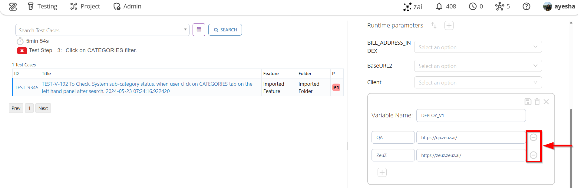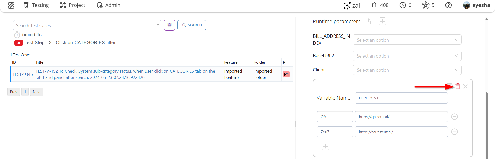 - If it is necessary to delete a specific Runtime parameter, click on the Delete icon located at the top of that Runtime parameter. The selected Runtime parameter will then be deleted.