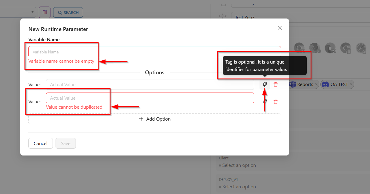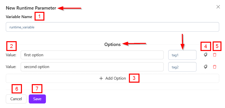 - The "+ Add Option" button allows the user to add more values for the runtime parameter.