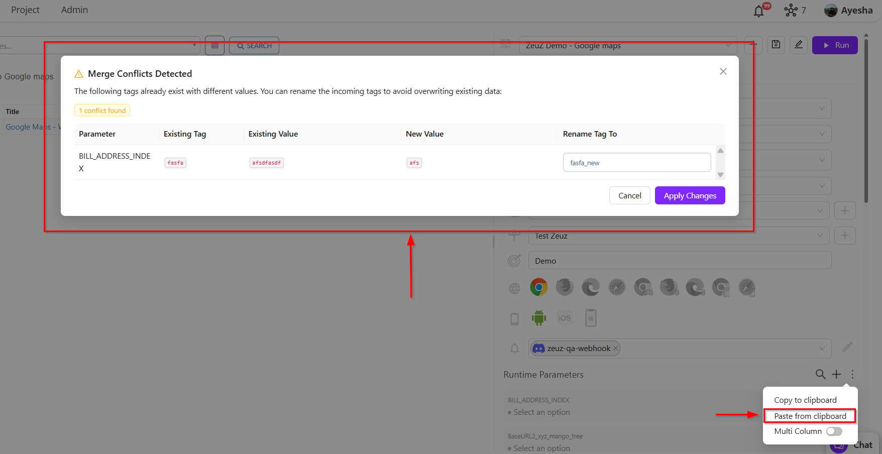 - If you want to copy from one team/project to another one, then click copy to clipboard and then in destination project/team clip paste from clipboard. If there are any conflicting tag and value then there will be a modal showing the conflict. You can change tag name to resolve conflict or you can keep same name to replace value with new value.