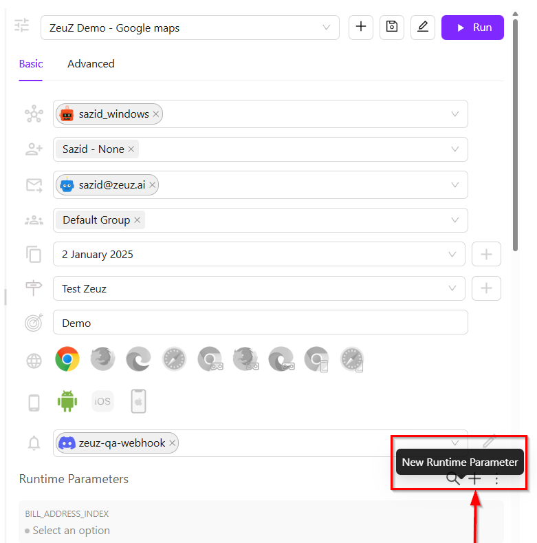 - Use the New Runtime Parameter (+) icon to add new runtime parameters.