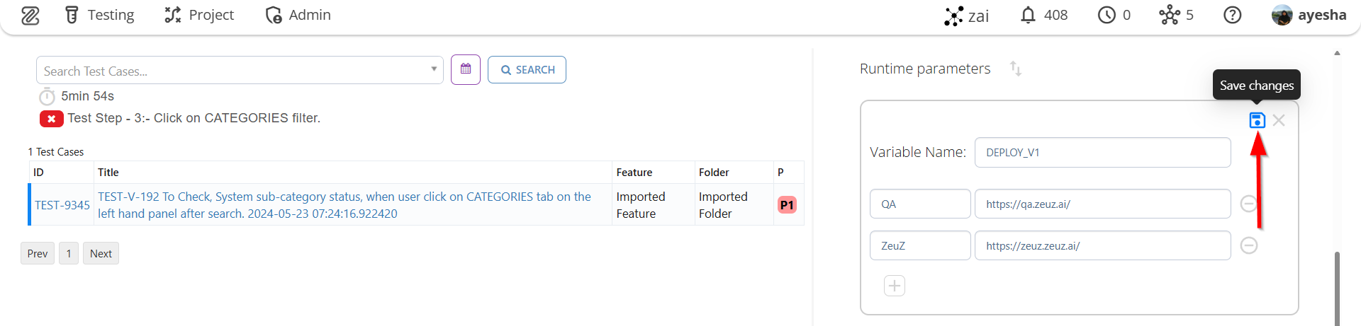 - Click the Save changes button to save the required details, which will then be displayed under the Runtime parameters.