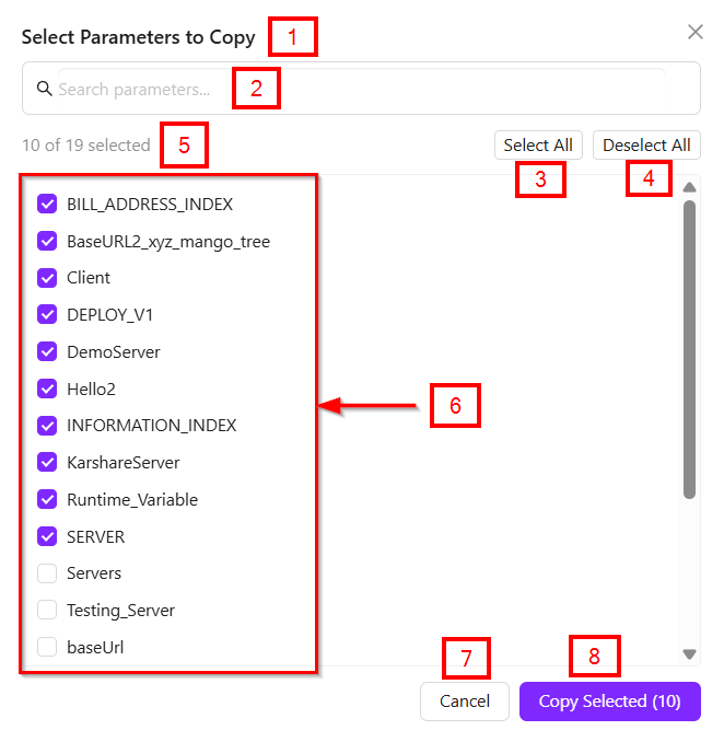 - Copy Selected (10): Proceeds to copy the currently selected parameters.
