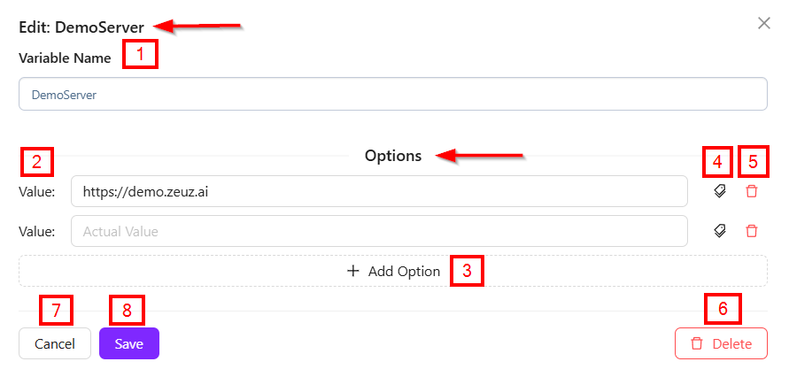 https://demo.zeuz.ai. A second empty field is labeled "Actual Value" for additional input. - Tag Icon: Optional; serves as a unique identifier for each parameter value.