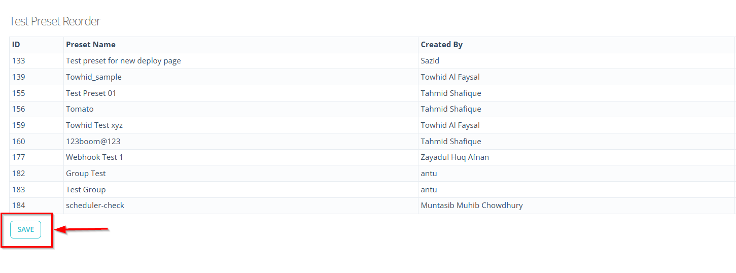 - After editing the sequence, click the SAVE button on the "Test Preset Reorder" page