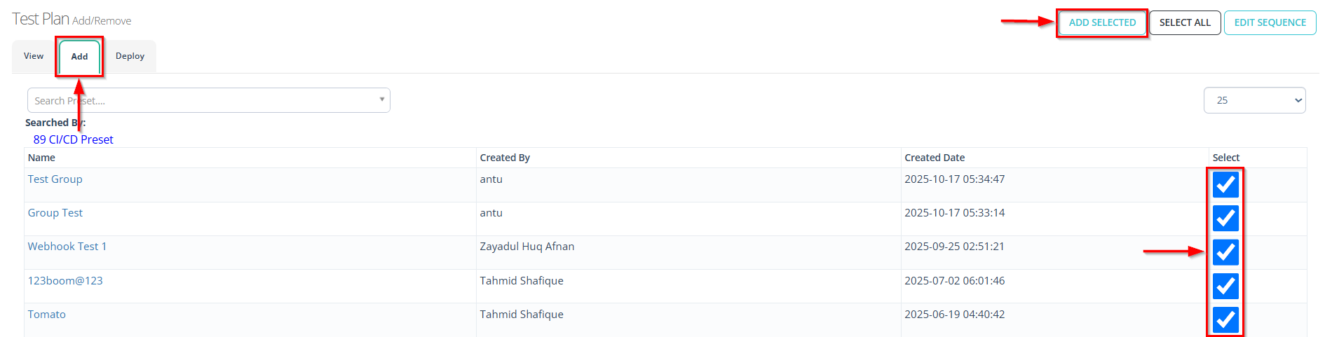 - Click on the "Add" tab on the Test Plan page of the selected plan.