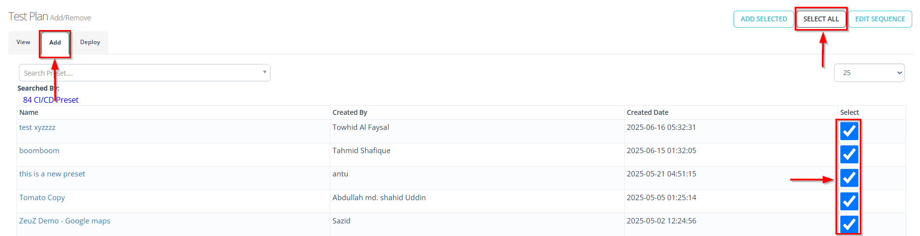 - If it is necessary to select all presets for the required test plan, click the SELECT ALL button in the "Add" tab.