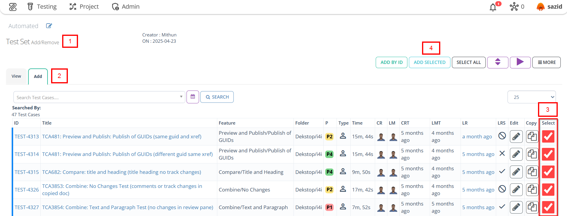 - Navigate to the Add tab, select some test cases and click "Add selected" to add some test cases to the set.