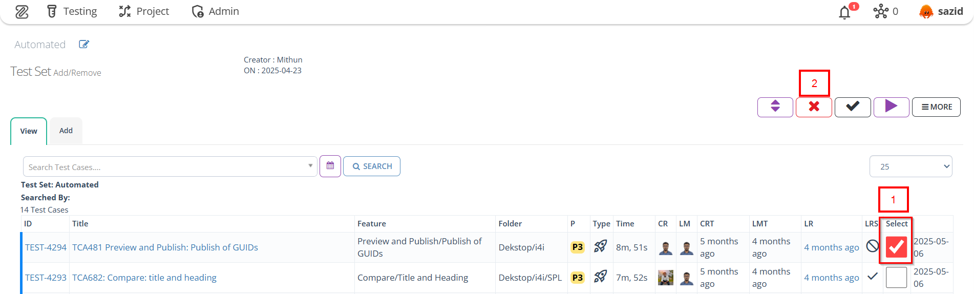 - To remove a test case, select the checkbox next to the desired test case, then click on the "Delete Selected" button. The selected test case will be deleted.
