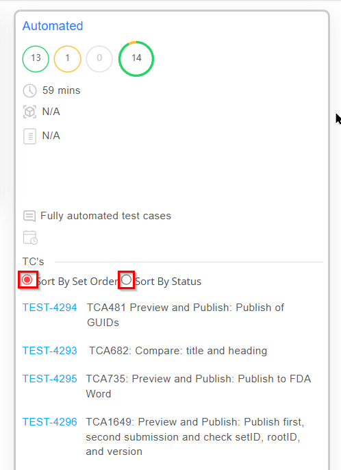 When the test set card is expanded, it displays the test cases belonging to that set. The test cases can be sorted in two ways: