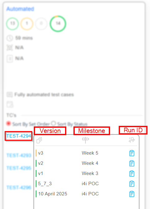 When sorted by "Status", failed test cases appear first, followed by blocked, passed, and not-run cases. Hovering over any test case shows its version, milestone, and run ID.