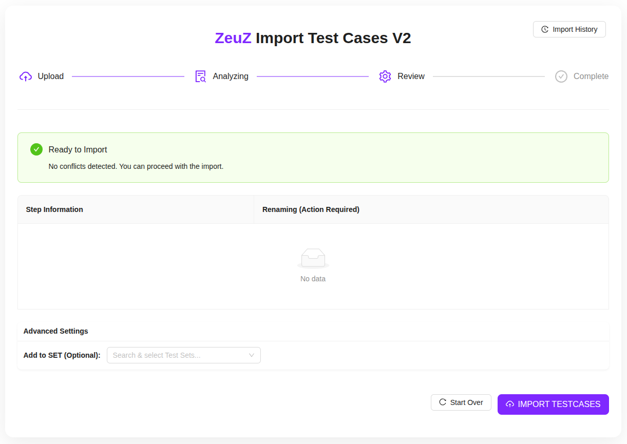 - The Import New Test Cases button enables users to start a new import process by uploading a file.