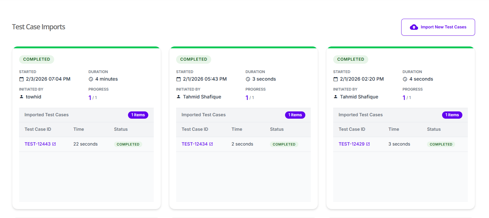 - Each card represents a single import operation and clearly shows its current Status, such as Completed which indicates that the test case import process finished successfully and all items were processed. while Stopped indicates that the import process was interrupted or manually stopped before completion..
