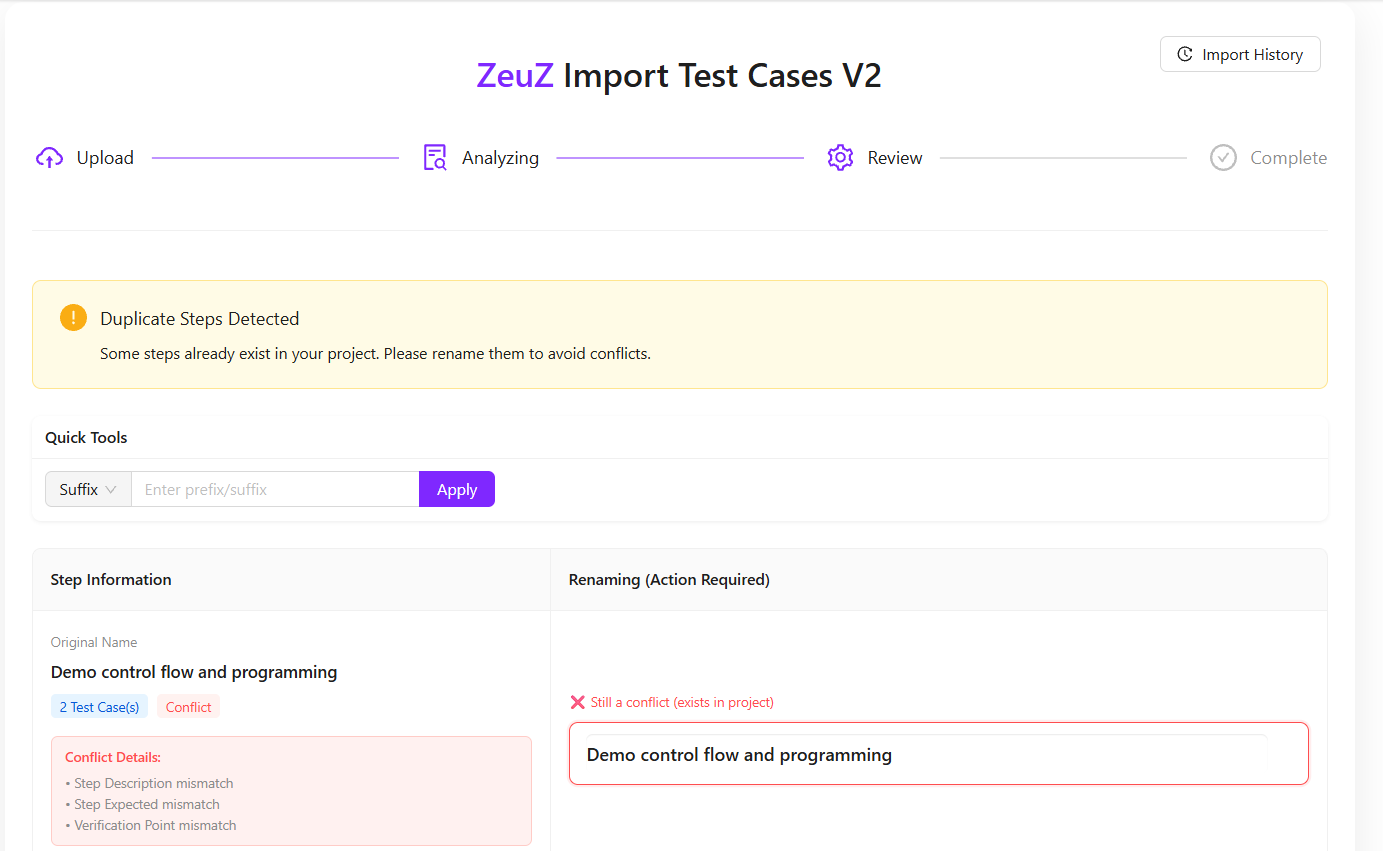 - Provides Clear Import Progress Tracking: The step-based flow (Upload, Analyzing, Review, Complete) helps users understand the current status of the import process.