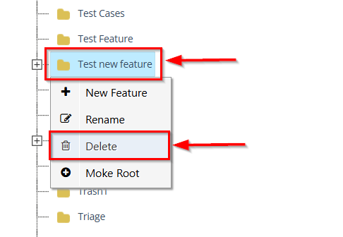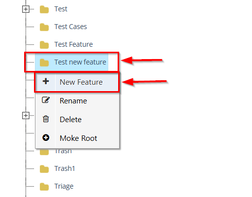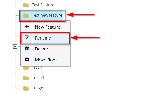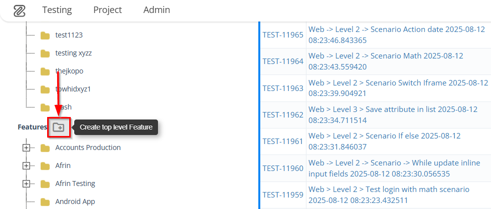 The Create top level Feature button lets users add a new main feature to organize test cases under a new functionality.