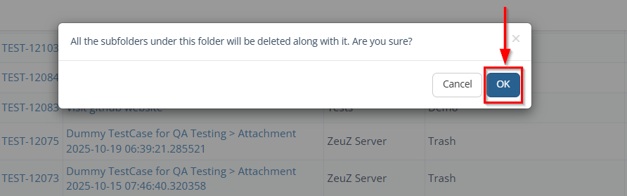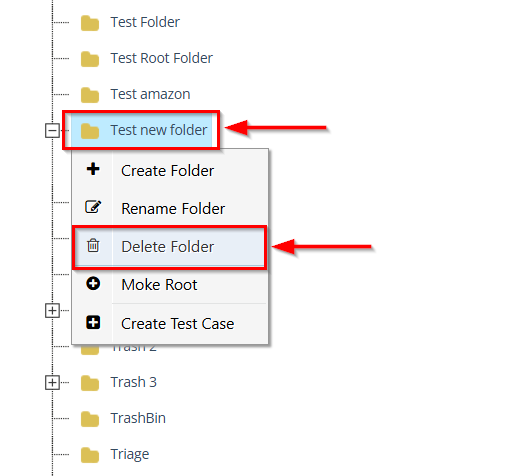 If any test cases are linked to the specific folder, it cannot be deleted, and a notification message will appear stating, βDocument or test cases are linked with this folder".