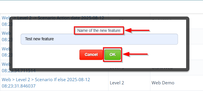- Click to enter the Name of the new feature (e.g., Test new feature).