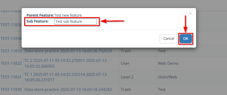 - Next, enter the name of the Sub Feature (e.g., Test sub feature).