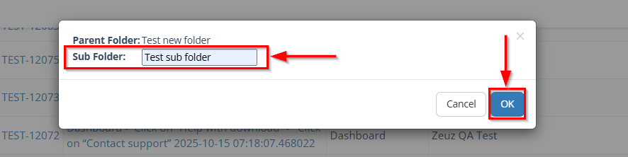 - Next, enter the name of the Sub Folder (e.g., Test sub folder).