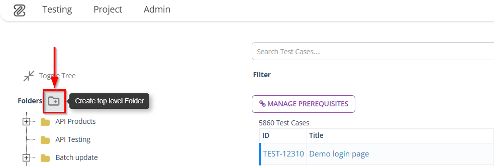 At the top of the panel, the Create top level Folder option is available. This option is used to add a new main folder, enabling users to define a new category for organizing test cases within the project.