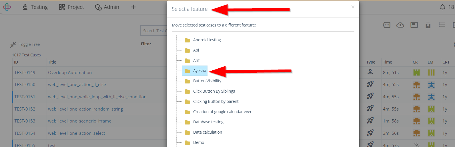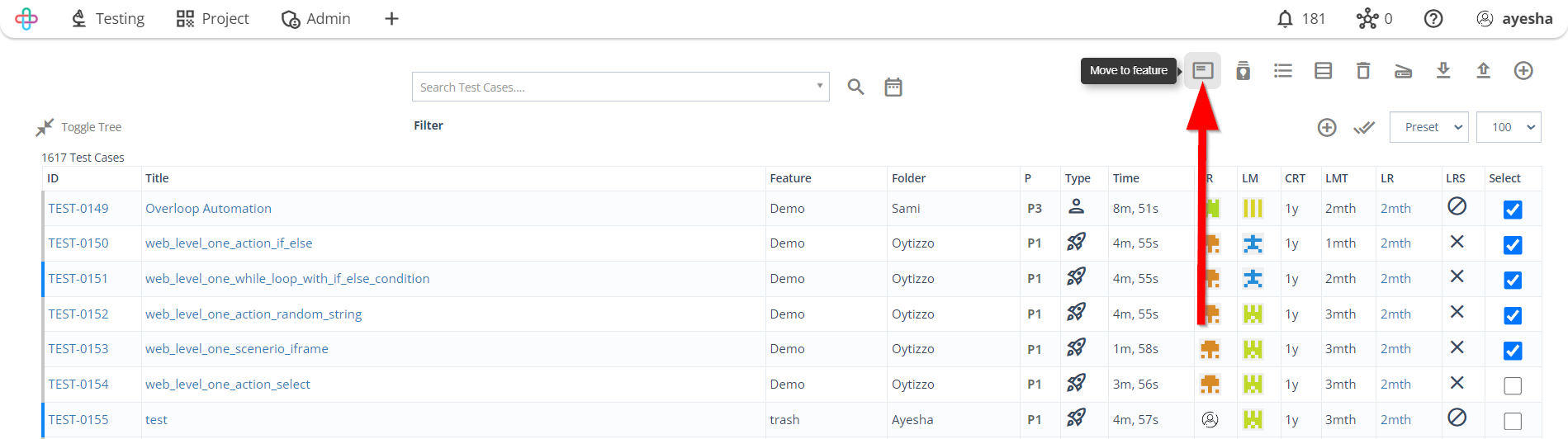 - Move to feature : The meaning of Move to Feature is to reassign or categorize specific test cases under a different functional or feature-related group for improved organization.
